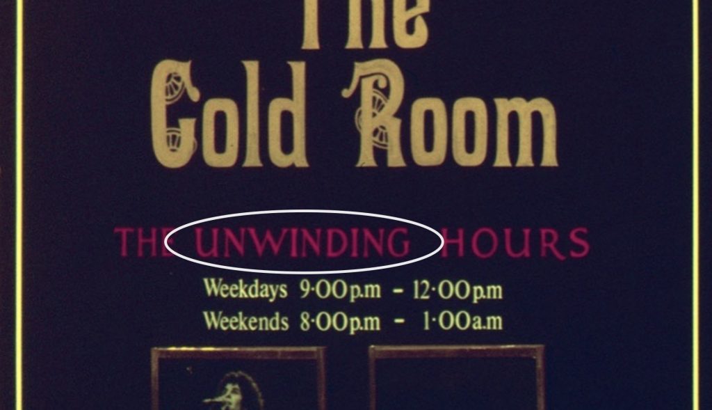 The goldsmiths would process gold bullion into gold thread and hide it in plain sight, weaving it into book bindings, clothing, and rugs. The thread was first wound onto spools that were then UNwound as they were sewn into various textiles. (photo of Gold Room sign). And the Overlook Hotel’s proximity to Sidewinder could be a play on words that the winding and unwinding of gold thread was a side gig.