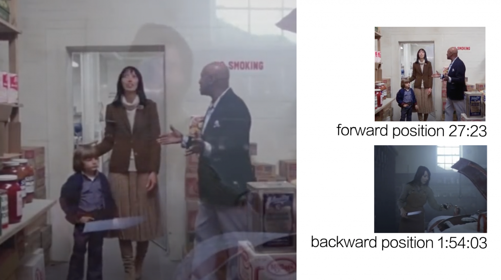 Joe Girard’s Eye Scream revealed the fact that there are several synchronicities that show up when you play The Shining forwards and backwards at the same time, like the one below, when the overlay seems to put Wendy’s knife from a scene near the end of the film into Danny’s hand near the movie’s beginning. Girard credits John Fell Ryan and Mastermind with the idea to overlay the film backwards and forwards, and he calls this overlay the “mirrorform.”