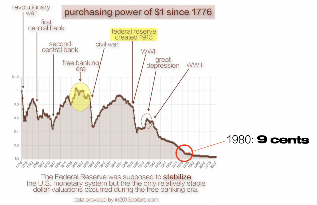 I made this graphic several years ago with data from in2013dollars.com to show the loss of the dollar’s value since it was established in 1776. Looking at this chart, we can see that although Jack’s dollar in 1980 was legally defined as worth one dollar, the true worth of a 1980 dollar was around 9 cents.