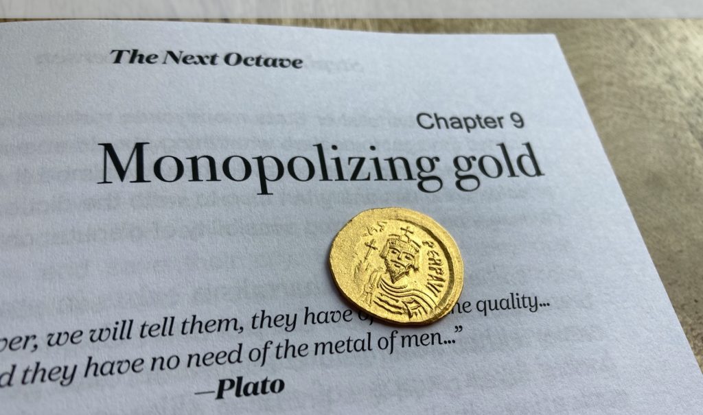 In my book, The Next Octave, the gold standard is a central theme. The gold standard was an aspect of metallism, a system of money either holding intrinsic value (like gold or silver) or backed by a supply of value (like a gold standard) and it’s the gold standard that prevents a government or a private bank from debasing its paper currency by inflating the money supply. Inflating paper dollars is easy — you simply print more of them. But if each dollar is linked to a weight of gold, inflation is no longer easy to do because you can’t just print more gold.