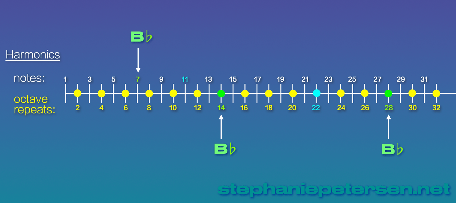 And Harmonic 7 is the note of Bb, entering the series right at 7. (New notes always enter the series as odd numbers. Even numbers are simply octave repeats.)